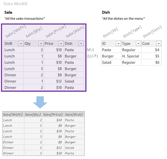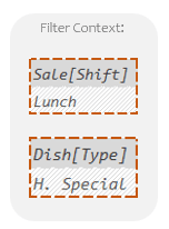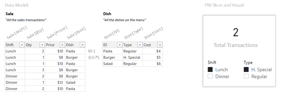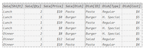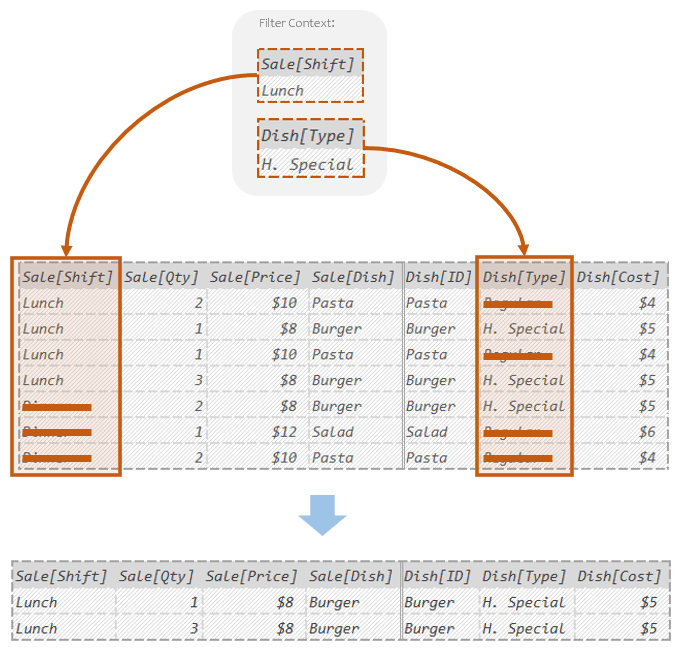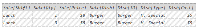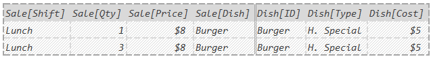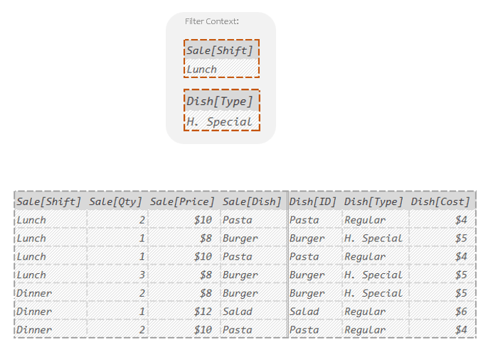Said differently: DAX only kept the rows where Sale[Shift] was “Lunch” and Dish[Type] was “H. Special”.