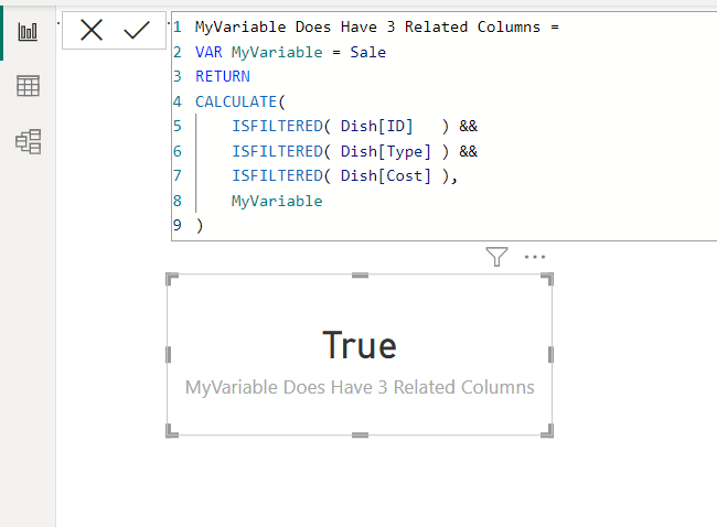 The Temp Table in MyVariable gets added to the Filter Context as a filter (there are no other slicers on the page so it’s the only filter in there). Since the Temp Table in MyVariable has all three Dish columns in it, the filter *also* has those three columns. When I ask if there’s a filter in place on those three columns the answer is True.