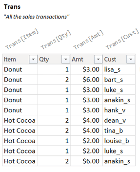 If we notice the users has sliced to look at Donut sales, which means we are looking only at the first five rows in the “Trans” table on the left. The Measure is returning 3. Do we trust it? Well, a smart human can look at the tables and note that: