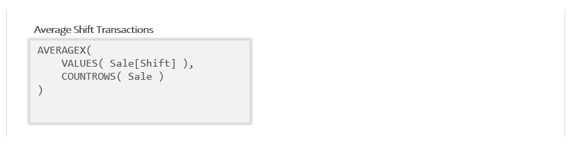 The name of the Measure we’re building is “Average Shift Transactions”. As the name implies, it should find the average number of transactions (rows) across both of our shifts. Since there are 4 rows for “Lunch” and 3 rows for “Dinner”, we should expect to get 3.5 (the average of 3 and 4).