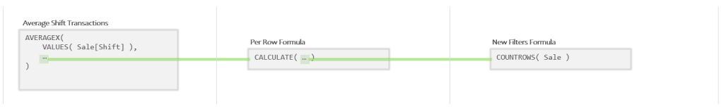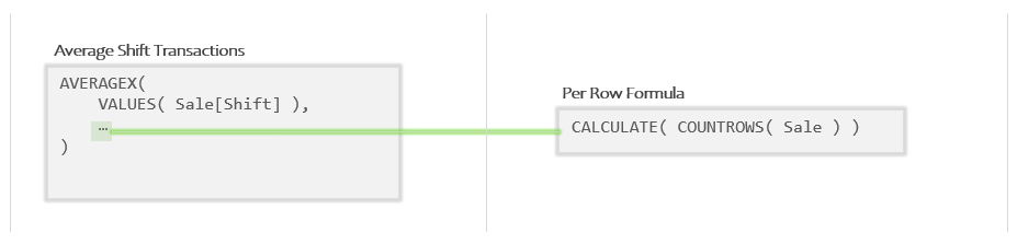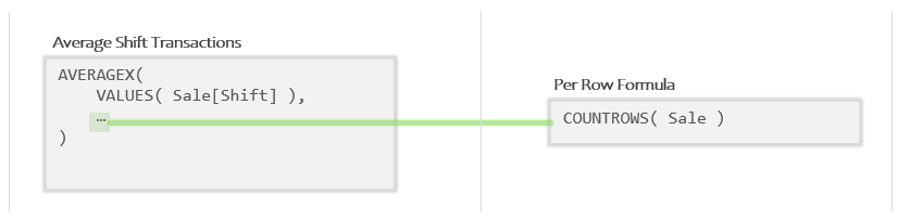 Since AVERAGEX is an Iterator, that means argument 2 is a Per Row Formula. Let’s decompose what we have above to pull the Per Row Formula out into its own little box: