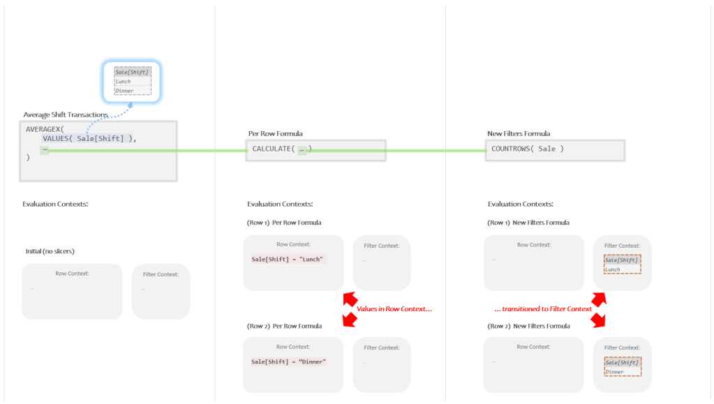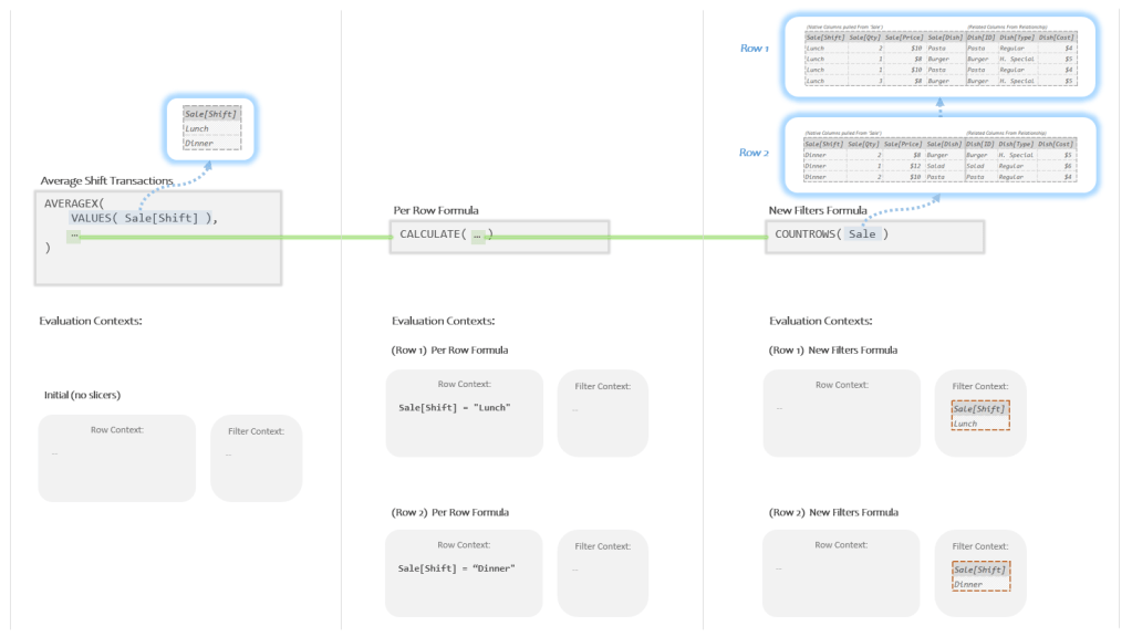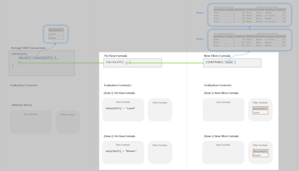 You might rightfully be wondering why AVERAGEX doesn’t just put “Lunch” both in the Row Context AND in the Filter Context? This way you could skip using CALCULATE to perform this awkward Context Transition thing.