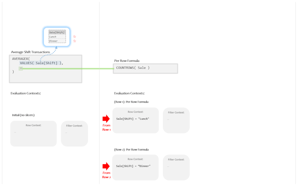 Mechanically, running “once per row” means AVERAGEX will use both rows of that Temp Table to create a *pair* of new Evaluation Contexts to run the Per Row Formula in. Each of the new Evaluation Contexts will have the values of one of the rows added into the Row Context.