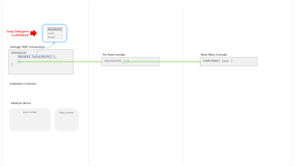 So AVERAGEX is going to take the Temp Table produced by VALUES and use it to create two new Evaluation Contexts for the Per Row Formula to run in: